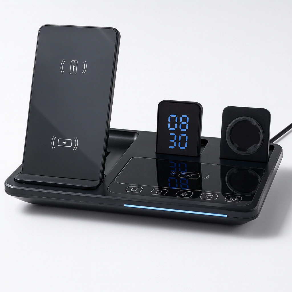 CARGADOR INALÁMBRICO TÁCTIL 4 EN 1 Optimiza la carga de tus dispositivos con este cargador inalámbrico táctil que permite cargar hasta 4 dispositivos simultáneamente. Ideal para mantener organizados y listos tu celular, auriculares, reloj inteligente y más, sin enredos ni cables. Su diseño moderno y funcional se adapta perfectamente a cualquier espacio. ¡Simplifica tu rutina y carga con eficiencia y estilo!